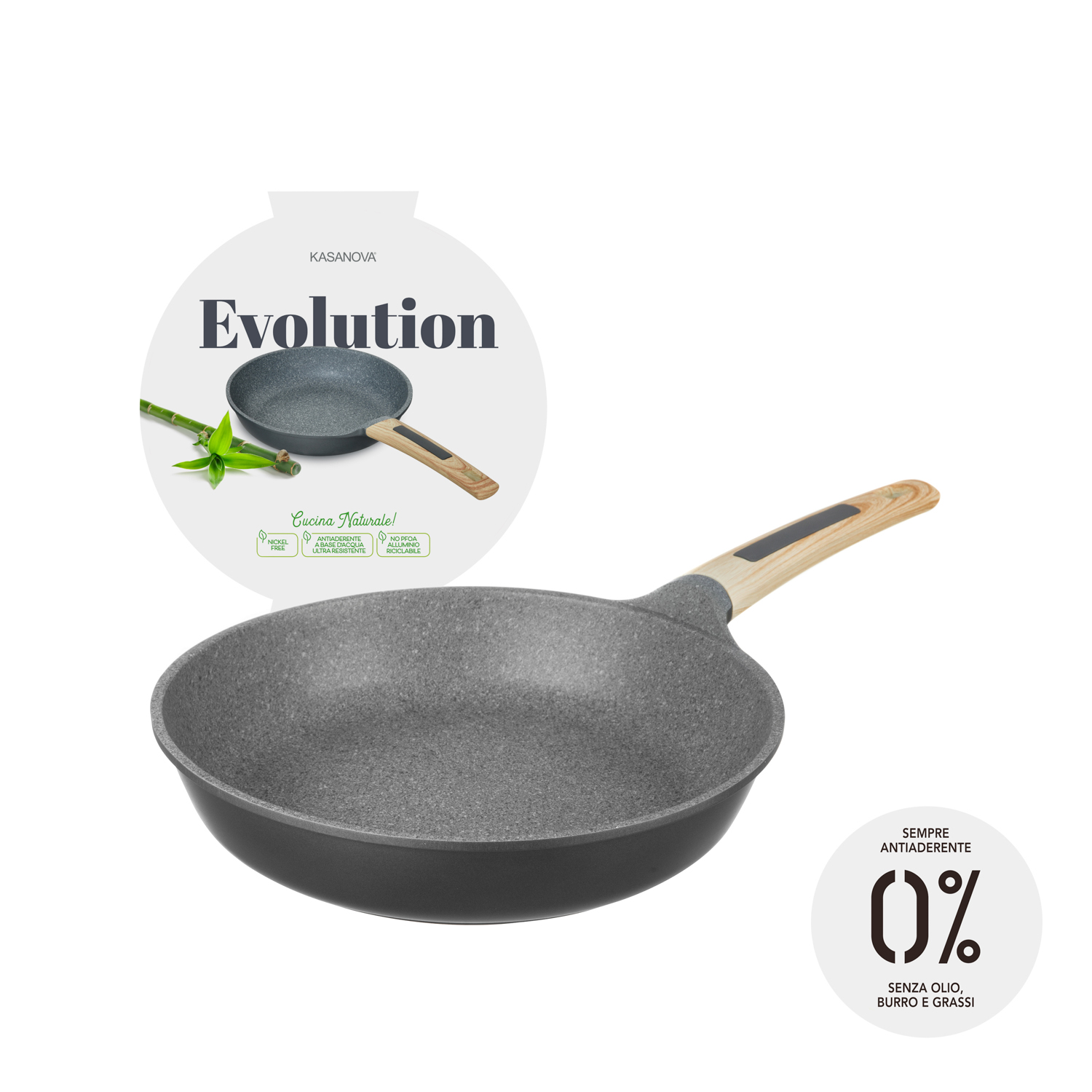 Evolution è la linea cottura antiaderente di dal design elegante con impugnatura completa di inserti in silicone per una presa comoda e salda. Adatta a tutti i piani cottura. Ottima antiaderenza: rivestimento antiaderente a base d'acqua per una cucina leggera con pochi grassi. I cibi non attaccano sul fondo e si pulisce facilmente a mano con una passata di spugna;