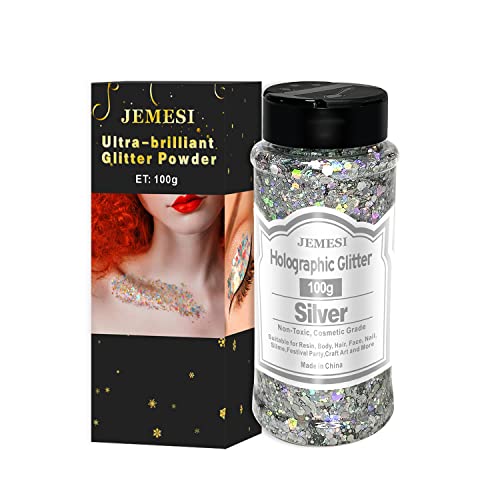 Paillettes Olografiche Glitter Grosso, JEMESI 100g Argento Olografiche Chunky Paillettes Glitter Unghie per Viso, Corpo, Occhi, Capelli, Unghie e Arte Fai da te
