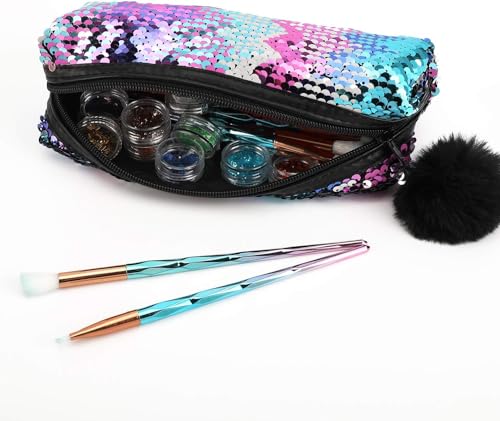 Paillettes a Sirena Astuccio per le Ragazze (colore reversibile), Borsetta per Trucco Cosmetico Glitter per Donna con Chiusura a zip Pompon (rosa blu mescolata con argento)
