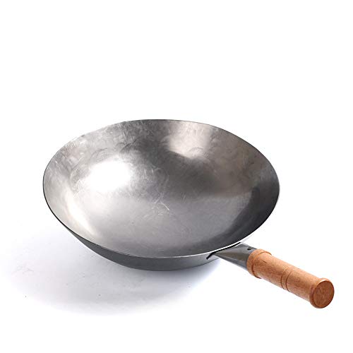 Paisdola Wok di ferro fatto a mano cinese spesso di 1.4mm con la maniglia lunga di legno, vaschetta asiatica 32cm