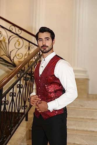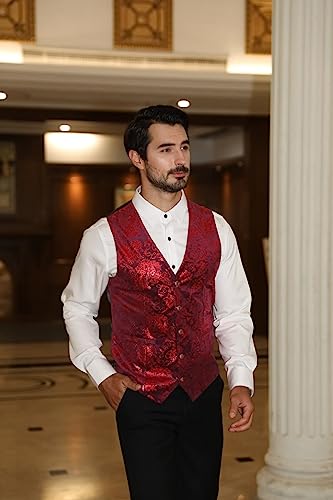 Mens Paisley Jacquard Suit Gilet Monopetto Vest Slim Fit Button Down Prom Abito Formale Gilet Rosso XXX-Large