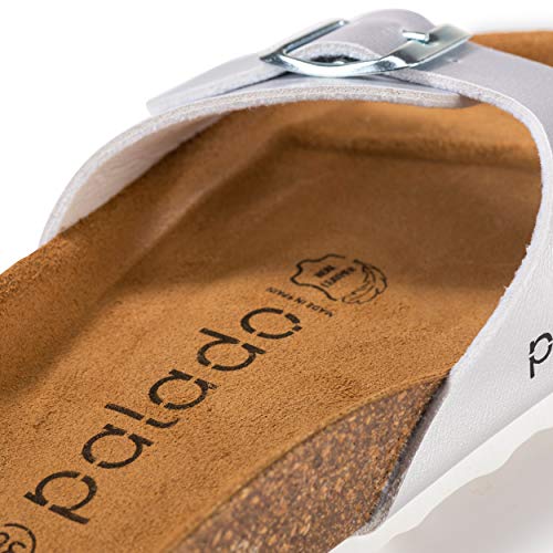 Palado Malta - Ciabatte da donna, sandali eleganti con cinghia regolabile e plantare in sughero, suola in pelle, argento opaco, 39 EU