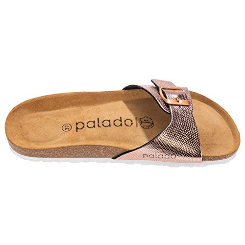 Palado Malta - Ciabatte da donna, sandali eleganti con cinghia regolabile e plantare in sughero, suola in pelle, 38 EU