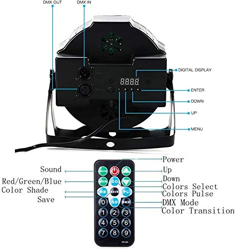 LED Colore e Modi Operativi: La luce a LED a 7 canali DMX-512 è dotata di 4 modalità(Può funzionare a telecomando): DMX, funzione di scorrimento automatico, funzioni di colore che cambiano passo dopo passo, funzioni di colore e opzioni di trasformazione istantanee. Variazione multicolore: 36 LED (12LED rossi + 12 LED verde + 12 LED blu)