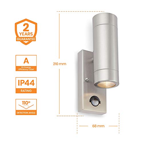 Palin - Luci esterne con PIR integrato - Luci esterne alimentate a rete - GU10 LED compatibili per esterni - Luci esterne in alto - Lampada da parete IP44 in acciaio inox spazzolato