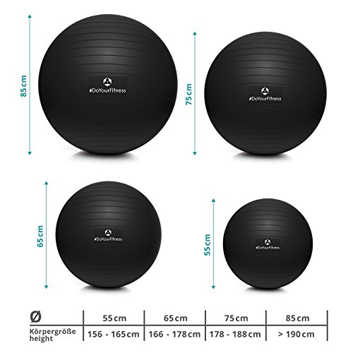 DIMENSIONI: La palla da ginnastica è disponibile in diverse misure. Le dimensioni vanno scelte in base alla proporzioni del corpo (peso e altezza). Funziona così: sedetevi sulla palla, le cosce devono essere in posizione orizzontale, in modo tale che la parte inferiore delle gambe formi un angolo di 90 gradi ed entrambi i piedi toccano terra. Disponibile nelle seguenti misure 55cm (156-165cm) 65 centimetri (166-178cm) 75 centimetri (178-188cm) e 85 centimetri (> 190 centimetri).