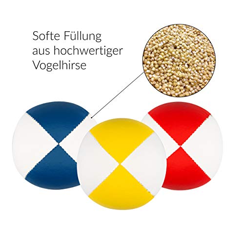 DETTAGLI DI PRODOTTO: ca. 115 g di peso per pallina I bicolore (rosso/bianco, giallo/bianco, blu/bianco) I diametro 67 mm, incl. istruzioni per la giocoleria