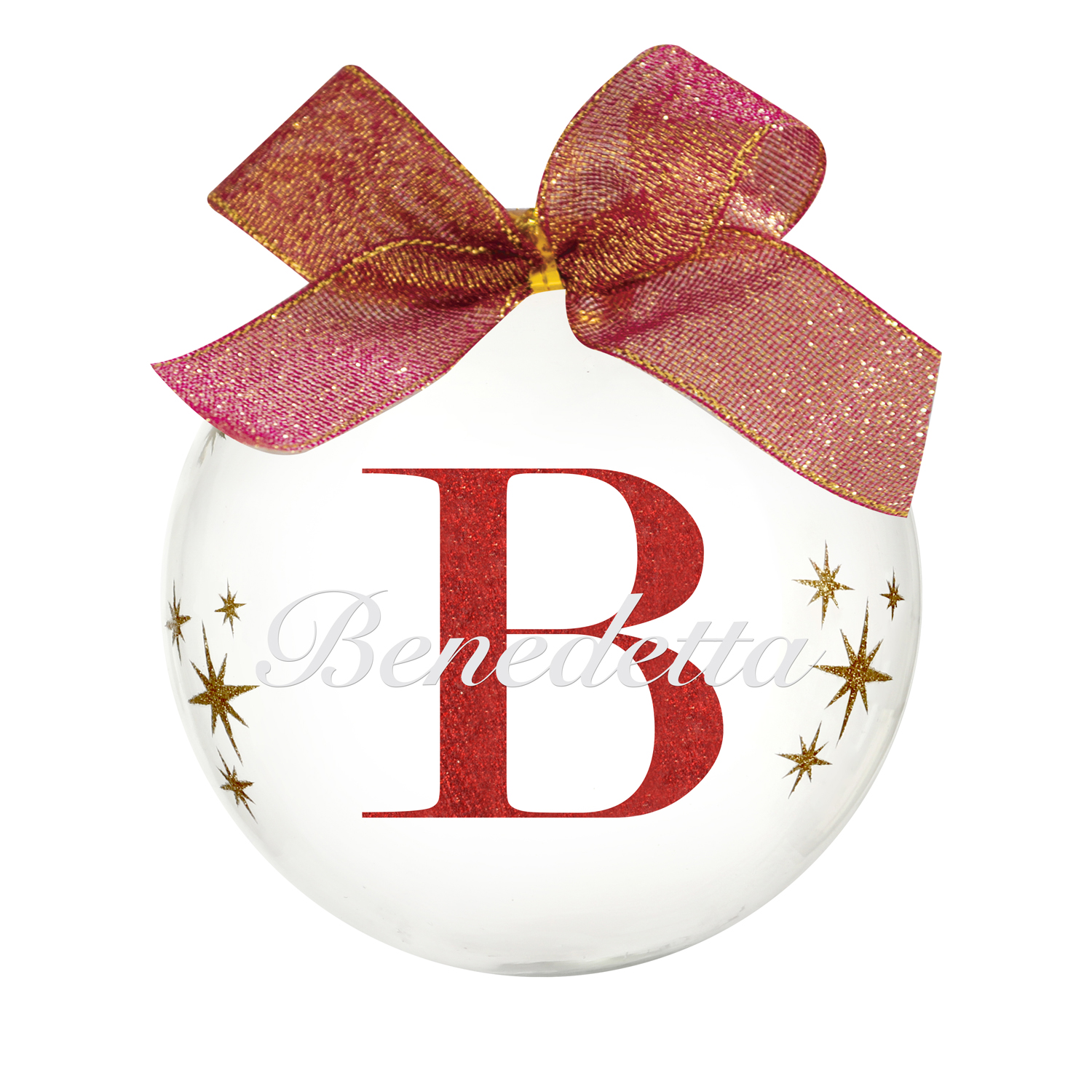 Rendi unico e speciale il tuo Natale con una decorazione natalizia col tuo nome! Questa palla di Natale in vetro è impreziosita da un decoro in rilievo con la tua iniziale e il tuo nome. Progettata e realizzata da Benny Setti in esclusiva per , è completata da preziose stelle dorate e un fiocco creato con un nastro rosso con glitter. Appendila all'albero insieme alle palline natalizie col nome della tua famiglia e dei tuoi amici! Puoi anche usarla come originale idea regalo: include, infatti, una raffinata confezione regalo chiusa con un nastro personalizzato col nome da te scelto. Diametro: 10cm.