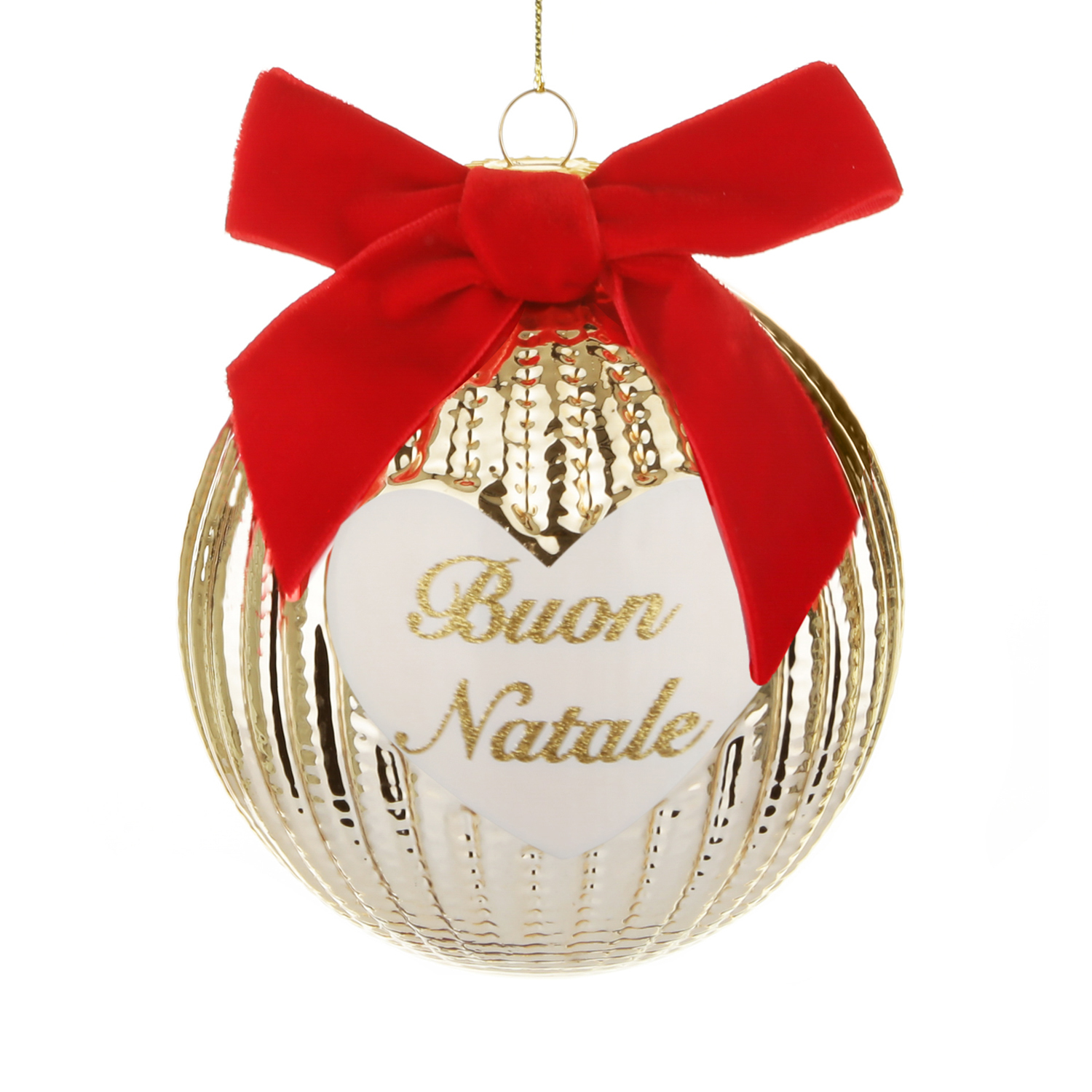 La designer Benny Setti ha disegnato per una nuova linea di palline di Natale davvero unica e brillante! Sulla cima svetta il bel fiocco rosso in velluto e la sfera con diametro 10 cm crea un delizioso effetto crochet oro lucido. Il tocco in più è dato dal cuore con scritta Buon Natale... davvero perfetta da appendere al tuo albero o da regalare a chi vuoi bene. È già confezionata in una bellissima scatola natalizia. Collezionala con le altre palline natalizie della linea.