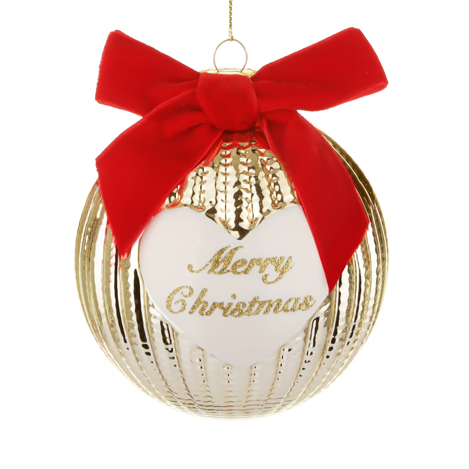 La designer Benny Setti ha disegnato per una nuova linea di palline di Natale davvero unica e brillante! Sulla cima svetta il bel fiocco rosso in velluto e la sfera con diametro 10 cm crea un delizioso effetto crochet oro lucido. Il tocco in più è dato dal cuore con scritta Merry Christmas... davvero perfetta da appendere al tuo albero o da regalare a chi vuoi bene. È già confezionata in una bellissima scatola natalizia. Collezionala con le altre palline natalizie della linea.