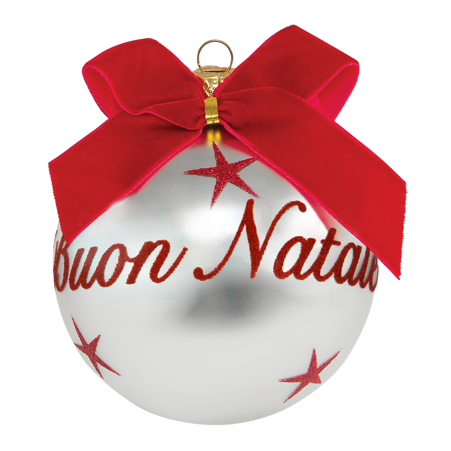 La collezione di palline Natale in vetro, con effetto argento perlato, è il perfetto regalo da fare ad amici e parenti. Realizzata da in collaborazione con la designer Benny Setti, è già confezionata in una graziosa scatola regalo e presenta un bel fiocco in velluto rosso e scritta Buon Natale glitterata. Potrai appenderla sui rami dell'abete tramite il pratico nastrino o posizionarla sulla tavola per arricchire il centrotavola. Diametro: 10 cm. Per la pulizia consigliamo di evitare sfregamenti con spugne o prodotti particolarmente aggressivi e di prediligere un panno morbido e delicato.