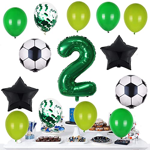 Set di palloncini da calcio per il 2° compleanno, 32 cm, con numero 2, in pellicola verde, palloncino nero a forma di stella, per bambini, ragazze,