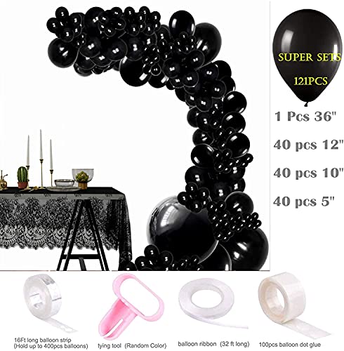 La confezione include: palloncini neri da 100 x 30 cm, palloncini neri da 100 x 25 cm, palloncini neri da 100 x 12,7 cm, 1 palloncini neri da 91,4 cm, 3 x 4,9 m, 3 x 4,9 m. Striscia di palloncino lunga m, 1 x 100 colla a pois per palloncini, 1 x 1 strumento per legare palloncini (colore casuale)