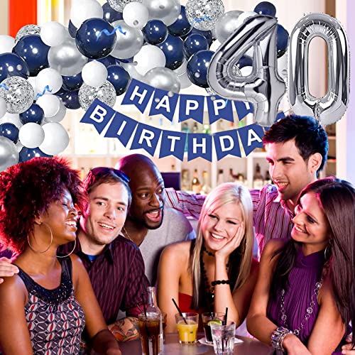 【Palloncini 40 Anni Compleanno】 Questo set di ghirlanda di palloncini blu argento contiene striscione blu navy "HAPPY BIRTHDAY", 32" numero x 1 pezzo, 12'' palloncino blu confetti x5 pezzi, 10'' palloncino in lattice x47 pezzi (blu navy, bianco, grigio), 5'' palloncino bianco x 10 pezzi, nastro e annodatore, catena per palloncini.
