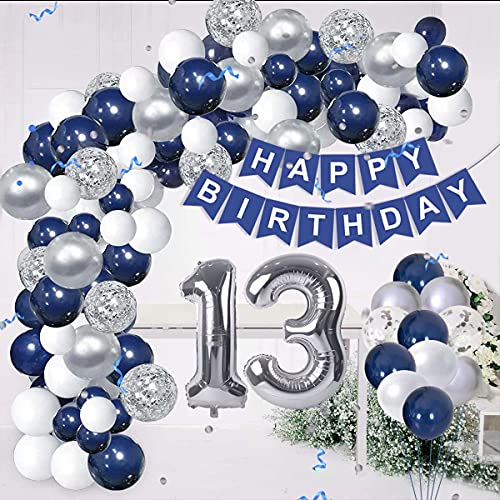 【Palloncini 13 Anni Compleanno】 Questo set di ghirlanda di palloncini blu argento contiene striscione blu navy "HAPPY BIRTHDAY", 32" numero x 1 pezzo, 12'' palloncino blu confetti x5 pezzi, 10'' palloncino in lattice x47 pezzi (blu navy, bianco, grigio), 5'' palloncino bianco x 10 pezzi, nastro e annodatore, catena per palloncini.