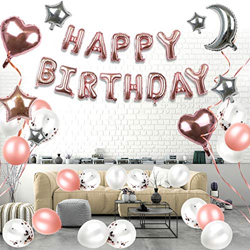 【BELLISSIMO SET】: Kit decorazioni per compleanno SKYIOL ha 55 pezzi: 13 fogli di lettere HAPPY BIRTHDAY oro rosa, 2 palloncini foil cuore oro rosa, 1 palloncino stella oro rosa, 1 palloncino luna argento, 6 palloncini stella argento, 10 oro rosa, 10 bianchi, 5 palloncini in lattice coriandoli oro rosa, 2 nastri in oro rosa 10 m, colla a 5 punti. Con una forma a cuore e stella e una grande lucentezza metallica, i palloncini in alluminio creano un'atmosfera romantica e sognante.