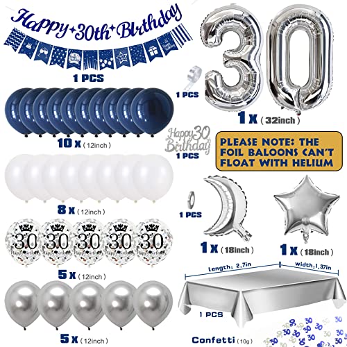 PALLONCINI 30 COMPLEANNO: decorazioni di compleanno blu navy include 1 striscione per il 30° compleanno, 1 striscione con bandiera a coda di rondine, 10 palloncini blu navy, 8 palloncini bianchi, 5 palloncini argento metallizzato, 5 palloncini con coriandoli argento stampati "30", 1x 32 pollici "30 "numero di palloncini in lamina d'argento, 1x palloncino a stella, 1x palloncino lunare, topper per torta di buon compleanno, tovaglia in lamina d'argento, coriandoli da tavolo 10g "30"