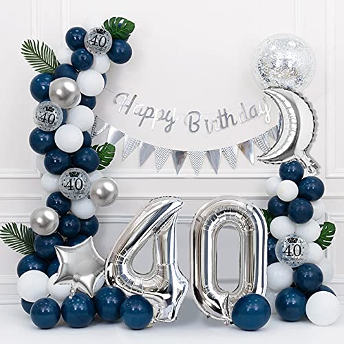 Palloncini Compleanno 40 anni: il pacchetto di decorazioni per il 40° compleanno include: 1x striscione argento buon compleanno, 1x bandierina triangolare argento, 10x palloncini blu navy, 8x palloncini bianchi, 5x palloncini argento metallizzato, 5x palloncini coriandoli argento stampati "40", 1x 32 pollici "40 "numero di palloncini in lamina d'argento, 1x palloncino stella, 1x palloncino lunare, topper torta di buon compleanno, tovaglia in lamina d'argento, 10g "40" coriandoli da tavola