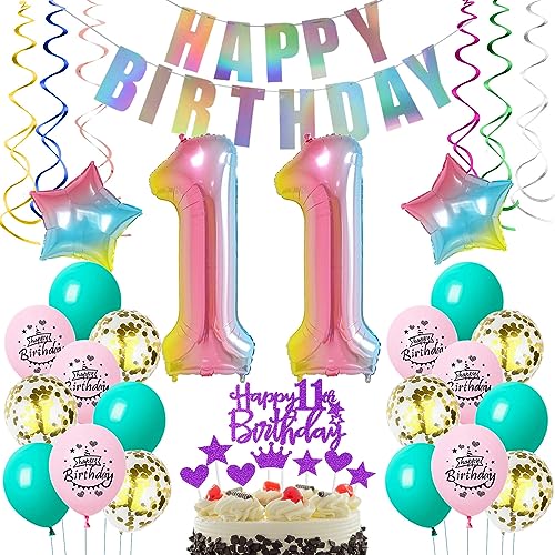 Decorazione 11 Compleanno Ragazza / Donna Rosa: Include 32 pollici palloncini verdi numero "11" in foil, 1 set ghirlanda Happy Birthday, 6x palloncini in lattice blu, 6x palloncini in lattice rosa (Happy Birthday), 6x palloncini coriandoli, 2x 18'' palloncini stella in foil, 6x decorazione appesa, 1 x decorazione torta Happy 11th Birthday, 3 x decorazione torta cuore, 3 x decorazione torta stella, 1 x decorazione torta corona, 1x nastri palloncini.