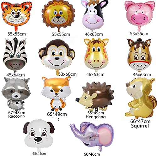 14 palloncini in pellicola con animali: riccio, scoiattolo, procione, volpe, maiale, scimmia, elefante, mucca, leone, tigre, giraffa, zebra