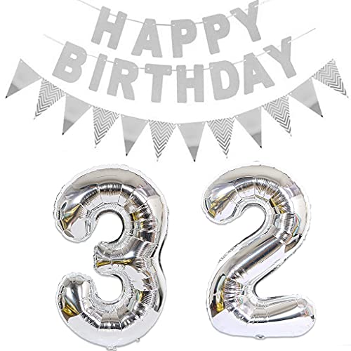 2 palloncini a forma di numero 32 argento + ghirlanda Happy Birthday + banner argento in pellicola per 32 anni di compleanno, decorazione per uomini e donne 32 anni di compleanno