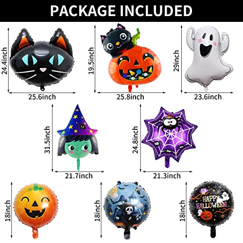 Palloncini decorativi per Halloween: riceverai 8 palloncini in lamina di Halloween, quantità sufficiente per soddisfare le tue diverse esigenze decorative. Viene fornito con il classico design del modello di Halloween come gatto nero, fantasma di zucca, ragno, pipistrello e teschio, che renderà la tua festa di Halloween piena di divertimento!