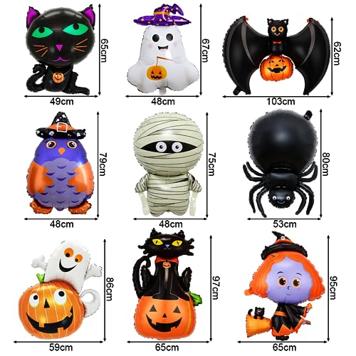 Palloncini Halloween, 9 pezzi XXL Palloncini Foil Zucca Pipistrello Strega, Gigante Palloncino Fantasma Gufo, Palloncini a forma di Nero Gatto Mummia Ragno per Festa Decorazioni Halloween
