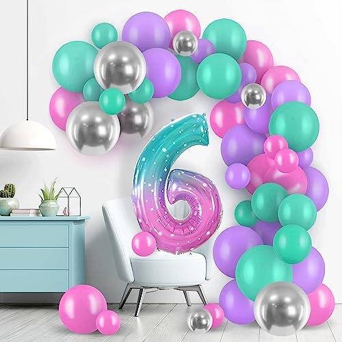 Set di 70 palloncini in lattice in rosa, turchese, viola e argento, grande numero 6, decorazione perfetta per il compleanno di una ragazza in rosa, palloncini di varie dimensioni