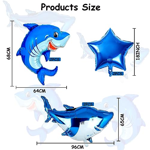 Riceverai 2 grandi palloncini con squalo (64 cm x 68 cm), 2 grandi palloncini bianchi con squalo (65 cm x 96 cm), 2 palloncini a forma di pentagramma, robusti, ecologici, infrangibili, durevoli e sicuri da utilizzare come decorazione per palloncini per feste.
