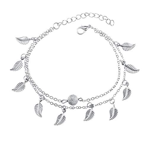 PAMTIER Due-Strato Piccole Foglie Singolo Perlina Estate Spiaggia Cavigliere Argento da Donna Lega