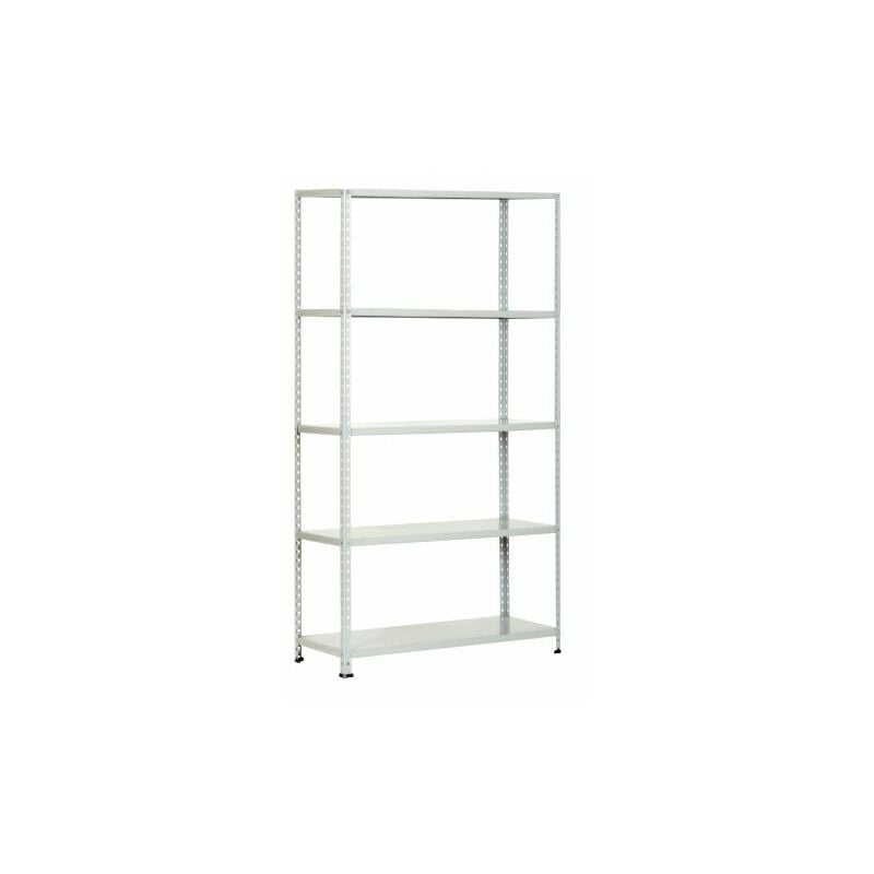 In lamiera verniciata colore grigio. Con aste intere. Cinque ripiani con 1 rinforzo. Con bulloni e piedini. Portata 80 kg per ripiano. Dimensioni cm 100x40x196h