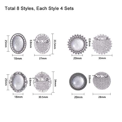 PandaHall 16pcs 4 Stili Lega Spilla cabochon castone impostazioni Pin cornici vuote Vintage con 16pcs cabochon in Vetro Trasparente per Accessori di Abbigliamento Creazione Artigianale