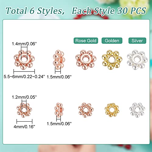 3 Colore Tra Cui Scegliere: Queste perline distanziatrici a forma di fiore sono disponibili in 3 colori, compreso l'oro, oro e argento di rosa, semplice ma luminoso, puoi scegliere il colore corretto da utilizzare in base alle tue esigenze, può abbinarsi bene con la maggior parte dei cavi o delle catene.
