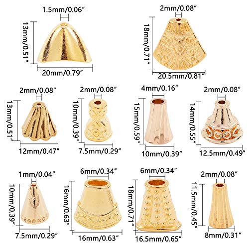 PandaHall 60pcs 10 Stili Tappi Cono Perline Dorate Tappi terminali in Metallo Perline distanziatori per la creazione di Gioielli
