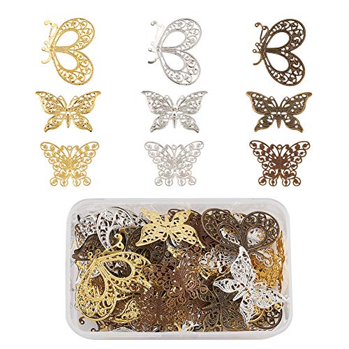 PandaHall, Ciondoli filigranati in ferro in 3 colori, a forma di farfalla, con connettori, per gioielli fai da te, 90 pezzi