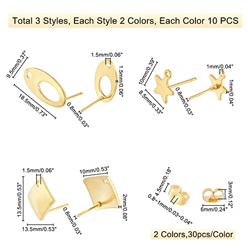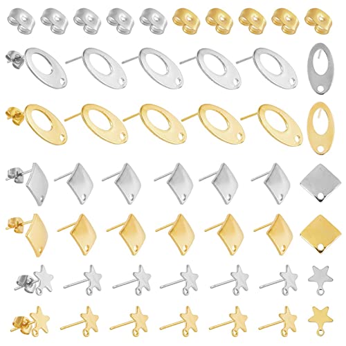 PandaHall 60pz 2 Colori Perni per Orecchino, Borchie per Orecchino in Acciaio Inossidabile con Dadi per Orecchie Ovale Rombo Stella Borchie per Orecchie per Donne Fai da Te Orecchini Artigianato