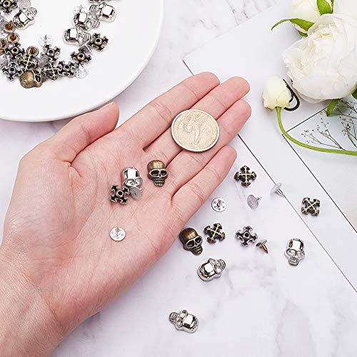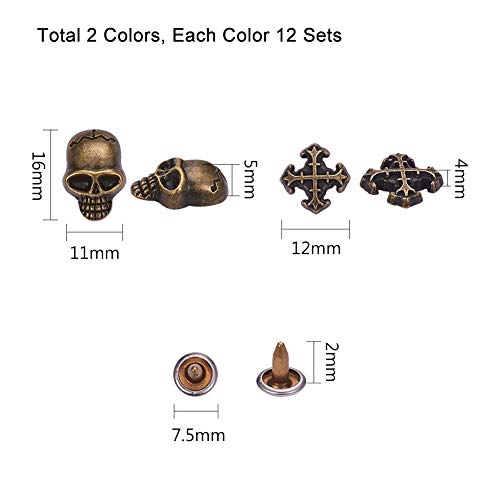 PandaHall 24 Set 2 Colori Testa Cranio Borchie a Croce Rivetti a Vite per Jeans Pantaloni in Pelle Artigianato Fai da Te, Bronzo Antico/Argento Antico