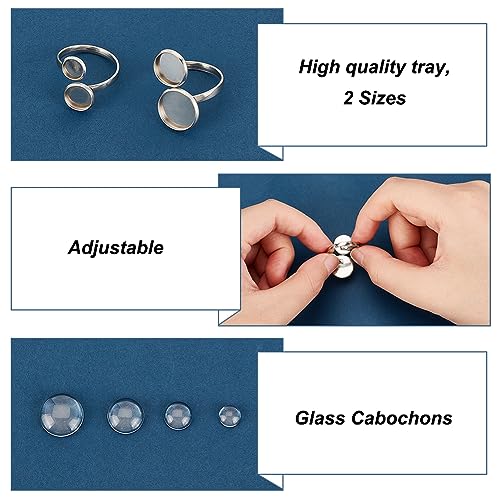 Vassoio per spazi vuoti per anelli: la base vuota per anelli da dito ha un diametro di circa 0.67 pollice (17 mm)., e le dimensioni dei cabochon in vetro trasparente sono 5.5/7.5/9.5/11.5 mm, 10pcs / size, ideale per incollare bottoni, perline, pietre preziose, foto o qualsiasi altra cosa per creare anelli unici. Grandi accessori fai da te per la creazione di gioielli per la casa e hobby.