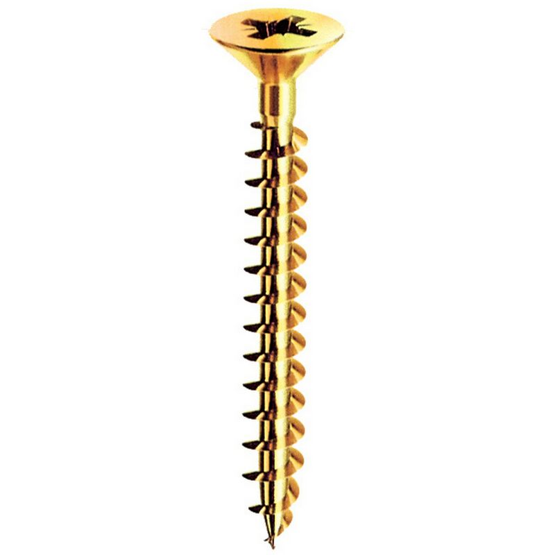 Mod. panelvit« in acciaio ottonato. per legno e pannelli truciolari, tasselli e lamiere sottili. lubrificate lubex. taglio a croce pz. testa svasata piana. diametro 6 mm lunghezza 80 mm