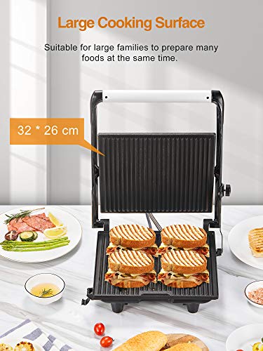 Superficie grill extra grande: piastre da 32 x 26 cm, possono contenere 4 panini o 6 panini medi alla volta. Con una grande superficie di cottura che offre più cibo e dimezzare il tempo di cottura in modo efficiente. Il grande manico resistente al calore consente di aprire e chiudere la macchina senza guanti da forno.