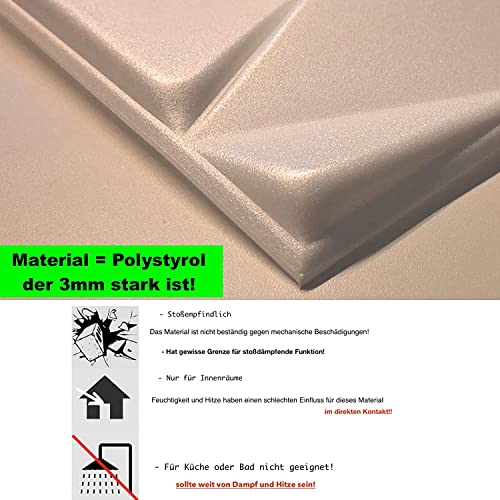 Il materiale dei pannelli da parete è spesso 3 a 4 mm. Il polistirolo ha un certo limite per la funzione di assorbimento degli urti. Il miglior paragone con questo materiale è un pacchetto da asporto (vedere foto). Il motivo in rilievo è alto fino a 2 cm (a seconda del modello). Il colore dei pannelli può variare leggermente rispetto al colore reale, in base alle impostazioni del colore sullo schermo del computer.