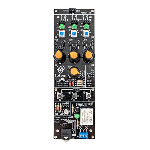 Elementi principali che costituiscono il pannello laterale I/O: commutatori a pulsante, con o senza LED, potenziometri, encoder rotativo, relè, connettore jack da 3,5mm e un bel LED RGB. Tutti gli elementi sono saldati con cura. Il tuo pannello laterale è pronto all'uso!