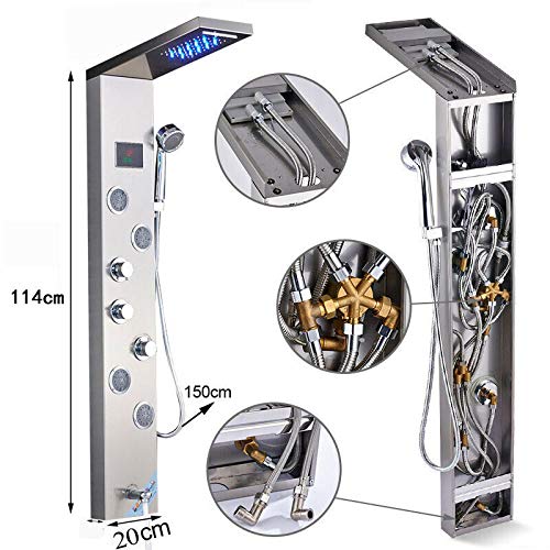 Pannello doccia a LED in acciaio inox con indicatore di temperatura e 4 getti massaggianti, colore: nichel spazzolato
