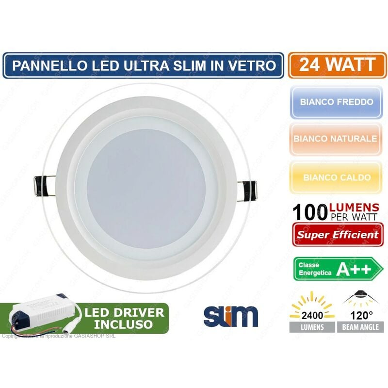 Pannello LED da incasso P-205E-T con potenza di 24W. Forma Circolare in Vetro e Alluminio di colore bianco. Fascio luminoso di 120° e flusso luminoso di 2400 lm. Questo pannello,ha un rapporto di 100 lm/W . Incluso driver già collegato al faretto, con cavi a saldare per la connessione all'impianto. Il pannello è dotato anche di clip per il fissaggio. Elegante e adatto all'incasso nei controsoffitti in cartongesso o legno, può essere sostituito in uffici, show room e sale conferenze. Questo modello di pannello è disponibile con 3 diverse temperature colore: Luce Bianca Calda 3000K, Bianca Naturale 4000K e Bianca Fredda 6500K . Dimensioni: Ø240 x 30 mm.