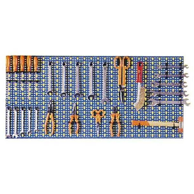 Codice: 8032591566193 Marca: SIPA. Lamiera acciaio forata verniciata Fori mm 12,5 e mm 5 Dotazione 40 ganci plastica assortiti Adatto per appendere utensili