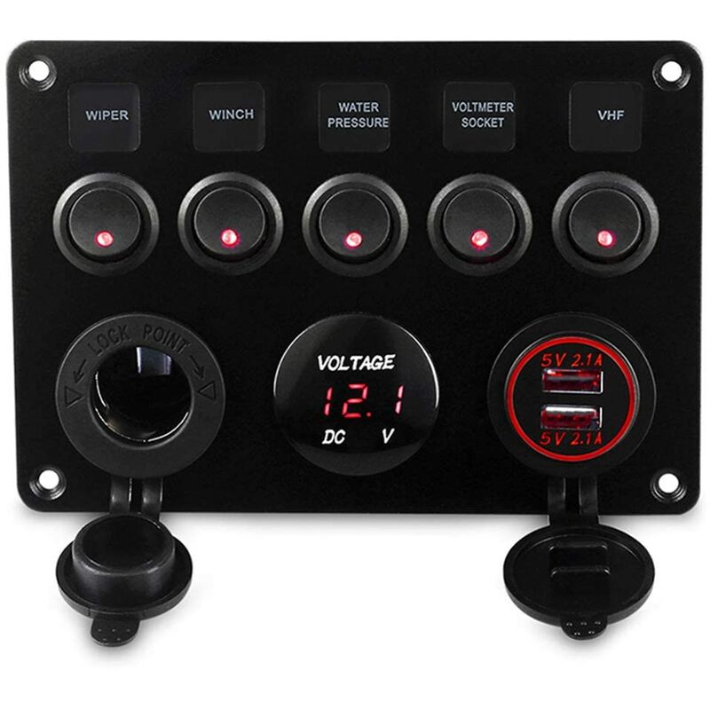 Interruttore a bilanciere multifunzione: include 5 interruttori a bilanciere a LED blu, prese per accendisigari da 12 V, doppio caricatore USB (5 V 2,1 A) e voltmetro digitale a LED da 12 V/24 V. monitoraggio del circuito, requisiti di carico e monitoraggio della tensione. Sicurezza e protezione impermeabile: il pulsante dell'interruttore è stato rigorosamente testato. Piastra in alluminio di alta qualità resistente ai graffi e alla corrosione con spina sigillata in gomma per tutte le prese a prova di polvere e detriti. Puoi anche usarlo a -25° (min) o 80° (max). IP65 impermeabile, certificato RoHS e CE, totalmente ecologico Resistente: il pannello è realizzato con una piastra in alluminio di alta qualità, che lo rende resistente ai graffi e alla corrosione. Puoi anche usarlo a -25 ℃ ~ 85 ℃. Luce LED blu incorporata, che consente di vedere chiaramente l'interruttore in un ambiente buio. Installazione semplice: il pannello è precablato, basta collegare la linea rossa al ? +? di cibo e