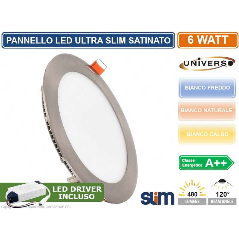 Pannello LED da incasso con potenza di 6W. Corpo in alluminio di colore acciaio satinato, con forma rotonda. Fascio luminoso di 120° e flusso luminoso di 480 lm. Pannello con un rapporto di 80 lm/W. Il driver è incluso e semplice da connettere al pannello tramite connettore 2 pin. Si connette alla rete elettrica tramite cavi a saldare. Adatto ad essere installato in uffici, showroom e sale conferenze, ma anche in abitazioni. Pannello LED ad alta efficienza dalle dimensioni ridotte. Nella confezione sono comprese anche le mollette di fissaggio e i morsetti a clip. Disponibile con 3 diverse temperature colore: Luce Bianca Calda 3000K, Bianca Naturale 4000K e Bianca Fredda 6400K. Dimensioni: Ø120mmx25mm. Dimensione foro incasso: Ø 105 mm.
