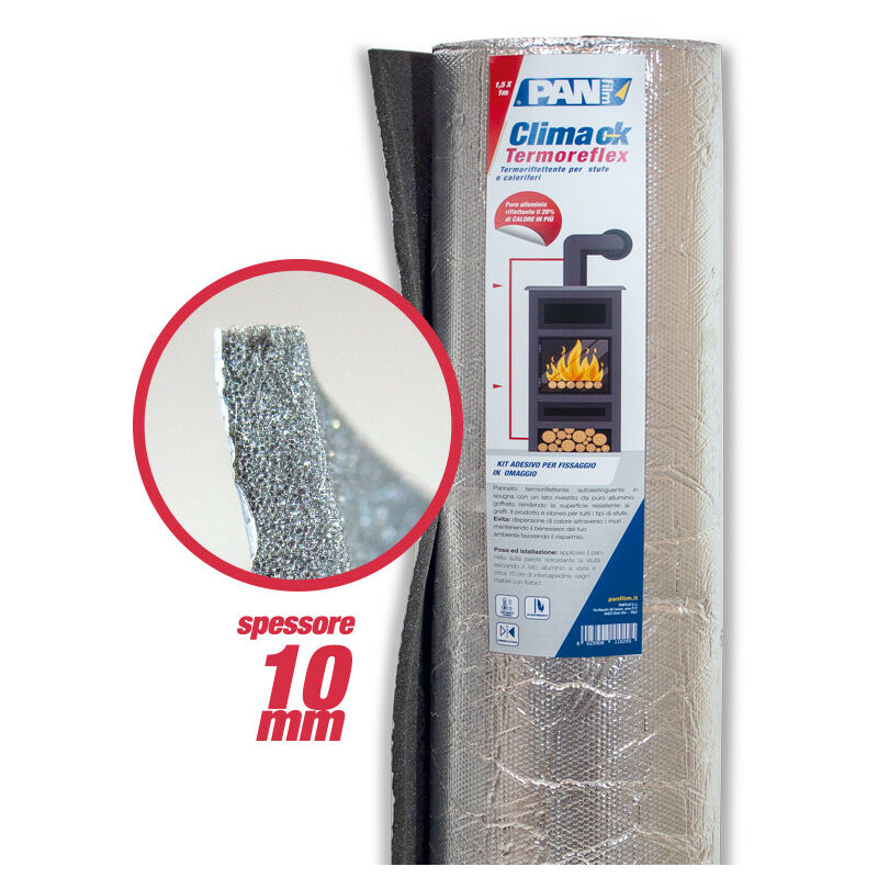 Pannello per stufa e caloriferi extra spesso 10mm con termo riflettente goffrato Il suo maggior potere isolante lo rende idoneo non solo ai termosifoni ma anche alle alte temperature generate dalle varie tipologie di stufe. Misura pannello 150cm x 100cm spessore 10mm. La parte interna è realizzata in polietilene a cellule chiuse, materiale perfettamente isolante, ricoperto da uno strato di alluminio goffrato. Prodotto omologato con scheda tecnica, MADE IN ITALY installare il pannello sul retro della stufa con lato in alluminio a vista. Efficace anche in presenza di valvole termostatiche. Caratteristiche: - Meno dispersione di calore, meno consumo energetico, più benessere per la tua casa;