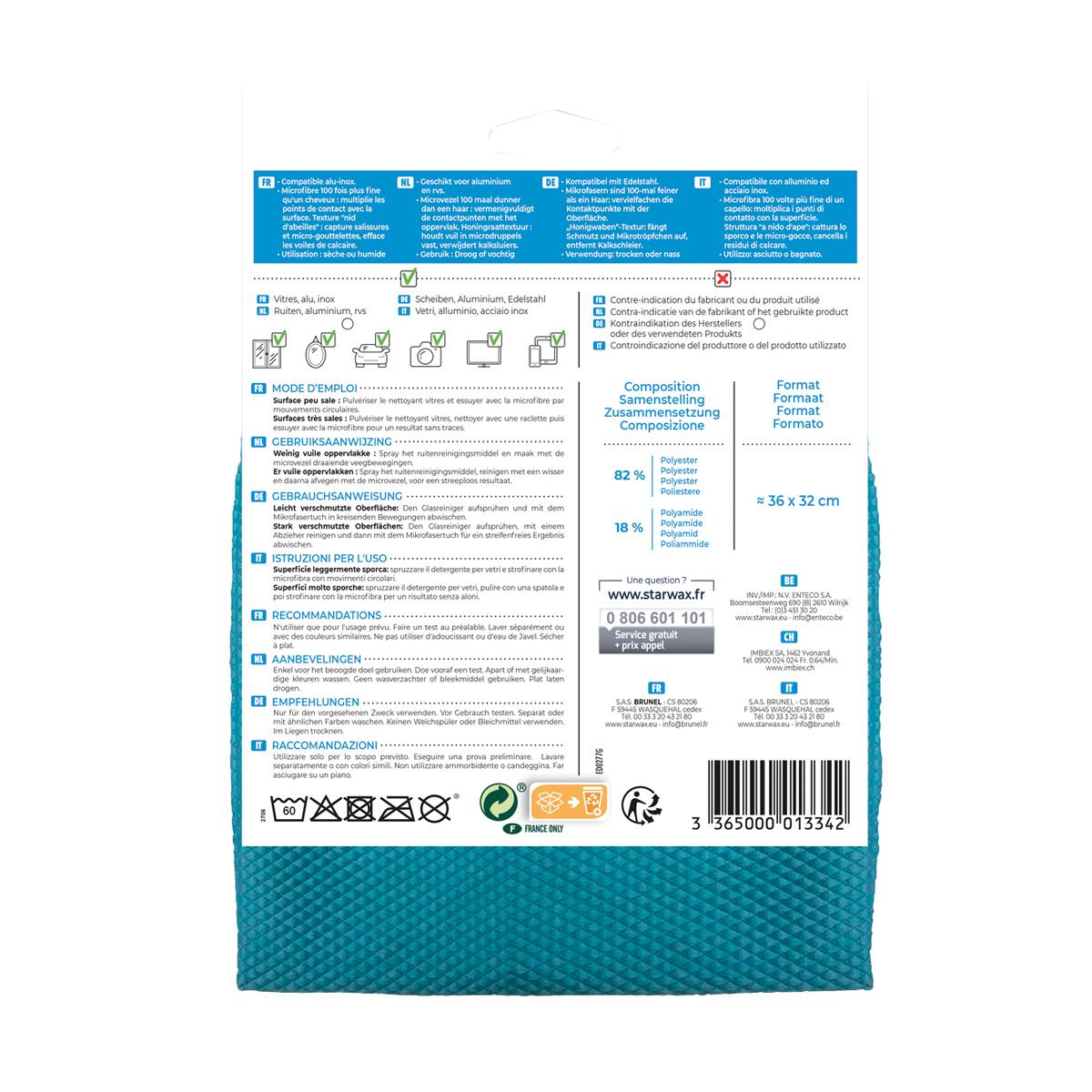 Panno Microfibra per vetri e specchi. Pulire vetri, specchi, vetri auto, schermi vari. Struttura a nido d'ape per catturare lo sporco e le micro gocce. Cancella le tracce di calcare. Elimina gli aloni residui. Compatibile con alluminio ed acciaio inox