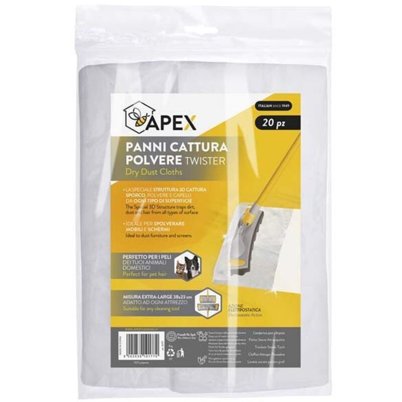 Panno 3D catturapolvere profumato usa e getta Raccolgono e trattengono sporco Lucidano pavimenti, non lasciano aloni Adatto per spazzolone Twister Tipologia - Apex Marca - Apex Modello - 10179 Caratteristiche - cm 40x23 Pz 20 lavanda